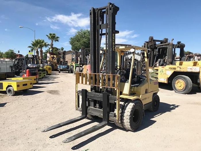2005 HYSTER FORKLIFT, MODEL H120XM, DIESEL POWERED, AUTOMATIC 2 SPEED MONOTROL TRANSMISSION, DUAL DRIVE WHEELS, SOLID PNEUMATIC TIRES, 12,000lb BASIC CAPACITY, 2 STAGE MAST (190.9” Max Lift Height) w/ SIDE SHIFT, 54” FORKS